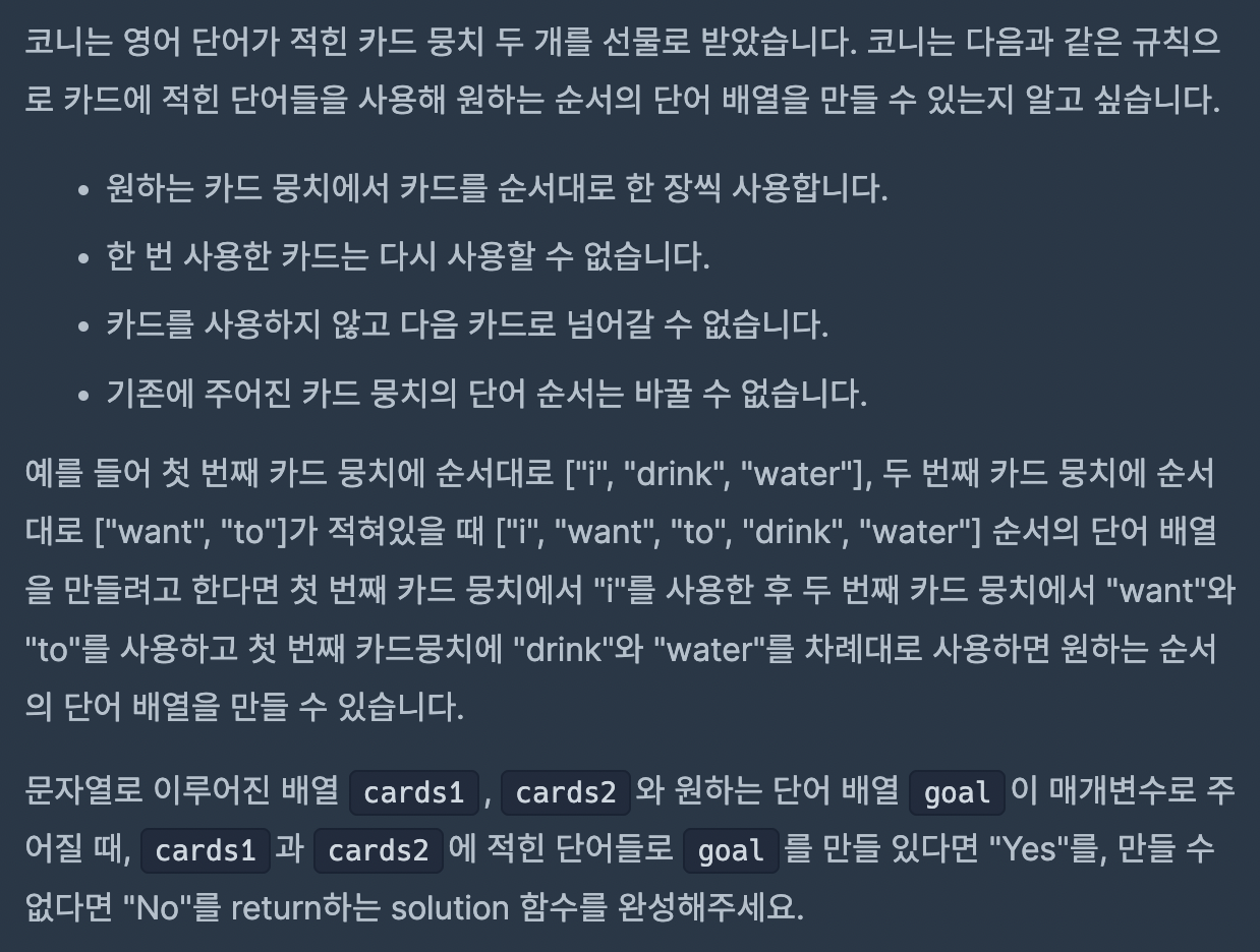 문제에 주어진 사항에서 card1과 card2는 어쨌든 goal의 맨 앞 index부터 들어가기 때문에 card1과 card2에 해당하는 초기 index값을 설정한 후 goal의 배열을 한 번 순회하면서 goal index 첫번째부터 맞춰가는 방식을 사용했음.. 이렇게 출면 반복문을 일단 한 번만 사용하면 되고, 내가 푼 것 보다는... 완전 깔끔하게 풀 수 있움 흑흑 (card1과 2의 인덱스 초기 index값을 변수에 따로 설정해주는 이유는 goal에 쓰이면 다음 index를 goal 요소랑 비교해봐야해서 그럼)